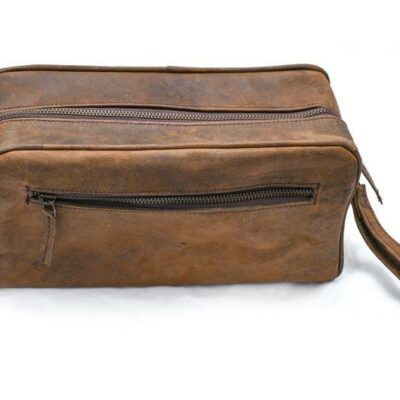 Vintage Brown Leather Toiletry Bag Single Zipper